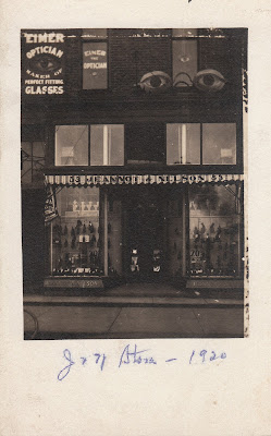 The sign here, mounted on Elmer the Optician's place in Muskegon Michigan dates to 1920. Elmer was Elmer P. Heimer, who had the top floor. It appears a shoe sale was going on below.