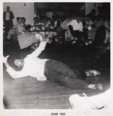 In researching the snapshot above, from 1955, showing an African-American man writhing on the floor, I was reminded of a brief fad from my junior high school days. A dance move so bold, so racy, so damn filthy that the minute ONE boy did it, the party was OVER. At the least, the offender was yanked up and sent home with a phone call to his parents .