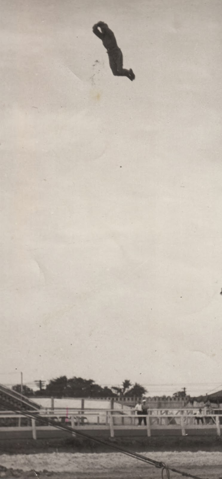 Shot from a Cannon. Fearless F. O. Gregg went on to daredevil fame with automobiles, but It would be hard to beat his "shot out of a cannon" stunt. He poses like an Olympian while flying...and this pose had to come while in transit.