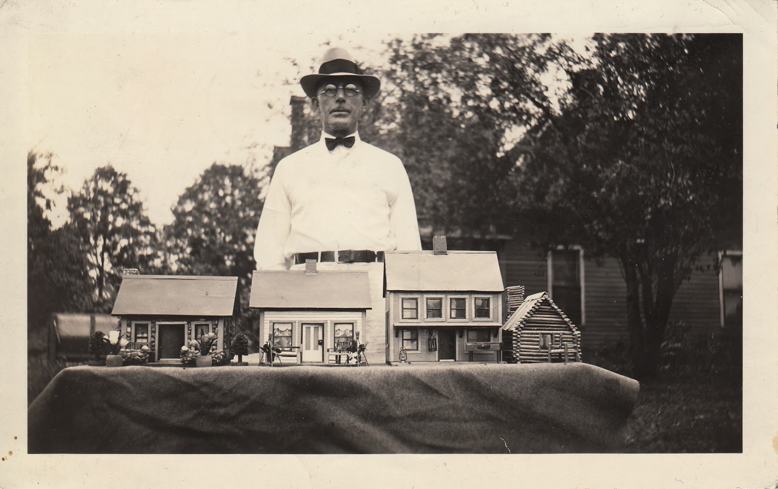 George Danner creates a miniature carved folk art city in 1934. On reverse "Mr. George Danner with his jack knife village"