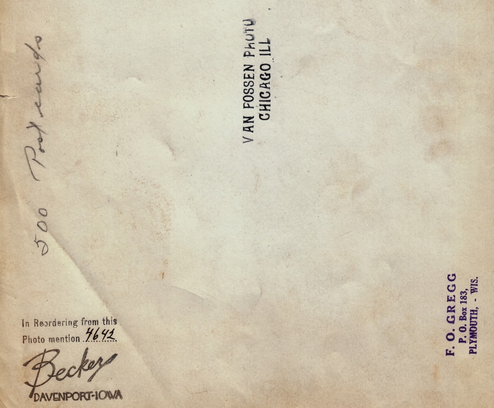 Original 8 x 10 photograph circa 1930 Van Fossen Photo Chicago, IL and Beckers, Davenport IA, and Real Photo Azo Postcard circa same. Collection Jim Linderman
