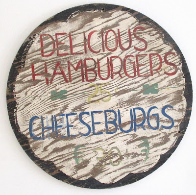 Painted by Hand Folk Art Sign Circa 1950 Delicious Hamburgers 25 cents and Cheeseburgs 30 cents. Collection Jim Linderman