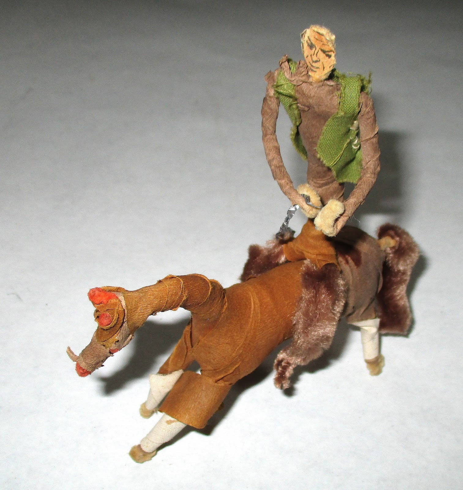 Antique Pipe Cleaner Cowboy, His Trusted Steed and a Large Cardboard Six Shooter Handmade Folk Art Toys circa 1950 Collection Jim Linderman
