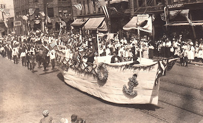 The story here is well documented for a Real Photo Postcard and it might provide some illumination on the photos and how they were used. A story of one 1919 parade float created by the Holland Michigan Furnace Company. As you will read, the good ship "Warm Friend-Ship" was used on July 4th and some of the fixtures were made of mashed sweet peas! NOTE: Only one of the women on the float was married.