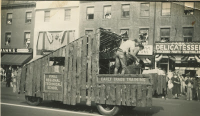 They are hanging out the windows to see the Vinal Regional Technical School "Early Trade Training" boys at work! They built a MOVING LOG CABIN! I'm not sure what is going on atop the float, but maybe they have a saw and are slitting more logs. I don't see safety glasses. I think that is taught before cutting these days.