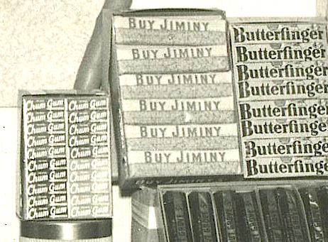 We see here not only the lovely queen of candy, but some graveyard brands. By Jiminy. Taffee Girafee. Chum Gum. Plus, some little goober with a comb over also apparently claiming the name.