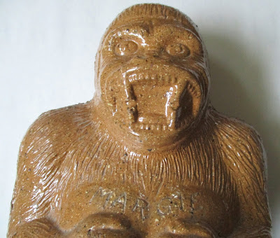 Large Sewer Tile Sewer Pipe Folk Art Gorilla Bank Early 20th Century 15".  Inscribed on chest "MARGIE" which could be the maker's daughter?  Likely based on King Kong..there have been numerous commercial banks with similar form sold over the years.  A massive piece weighing  nearly 13 pounds.  Collection Jim Linderman