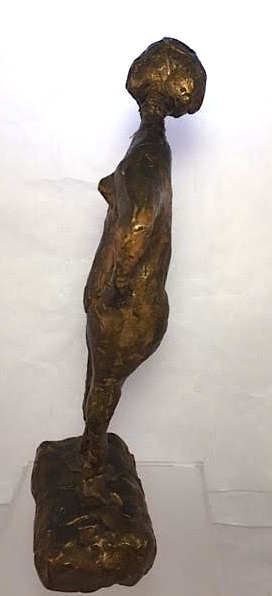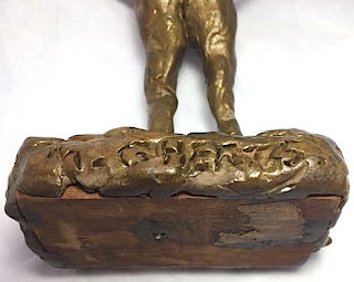 Folk Art Nude Woman of Clay (or putty or chewing gum!) sealed with gold paint. Unfired and built on a wooden base by M. Ghertz. Circa 1940?