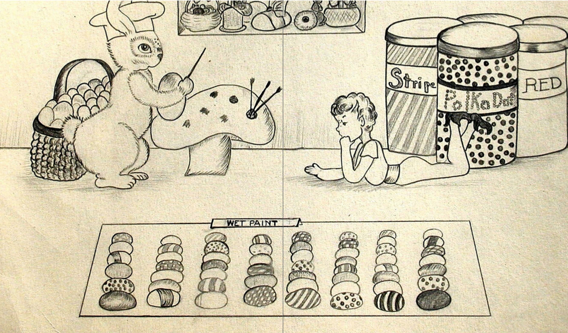 Drawing of Easter Egg decorating. Margaret Halpin, New York, Circa 1950
