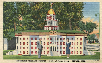 Miniature building on Original postcard c. 1950. I haven't identified the person who built this scale copy of the Colorado State Capital building with ONE HAND, but maybe you can. It's too nice a day to stay inside. Apparently the model no longer stands.
