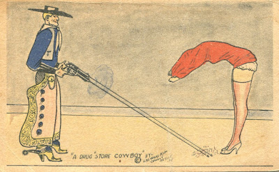 Las Vegas Kim was a real cowboy artist active in the 1930s. J. Edgar Kimsey was also the postmaster of the small town of Texon, Texas. He was more specifically a cowboy postcard artist of sorts…and that is one with a ribald, romping nature too. The West was his place and time. As reflected in his work, he was a bull rider too. The cards themselves are beautiful little relics of Texas past with an unusual primitive printing technique. The cards appear to have been tinted by hand, but aren't. It is also nice to know Mr. Kimsey had a risqué side. Several of the postcards here were shared by the Fire House Museum of Crowell, Texas online years ago. There are a few mentions of Mr. Kimsey online. One is in the book Texon: Legacy of an Oil Town. and I remember a longer, more complete post online years ago. However, ANY search with "kim" in it is going to give you a passel of Kim from Las Vegas you probably aren't searching for.