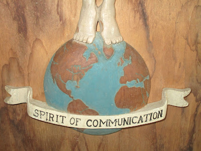 Antique American Folk Art Sculpture Carving of the Spirit of Communication Golden Boy AT&T Statue. An early 20th Century folk art rendering of "Spirit of Communication" also know as Golden Boy. The wood carving is 23 inches tall and mounted (with two screws from behind) on old plywood. Golden Boy was one of the largest sculptures in New York City, second only to the Statue of Liberty in size. Golden Boy was created as the corporate logo for AT&T in 1914. The design was by Evelyn Beatrice Longman. The 24 foot tall gold leaf statue was mounted atop 195 Broadway. For decades, the image became familiar through use on AT&T telephone directories. The statue remained in place until 1984, when it was moved to Madison Avenue, then to Basking Ridge, New Jersey. It is now standing in the lobby of SBC in Dallas, a company which adopted the AT&T name.